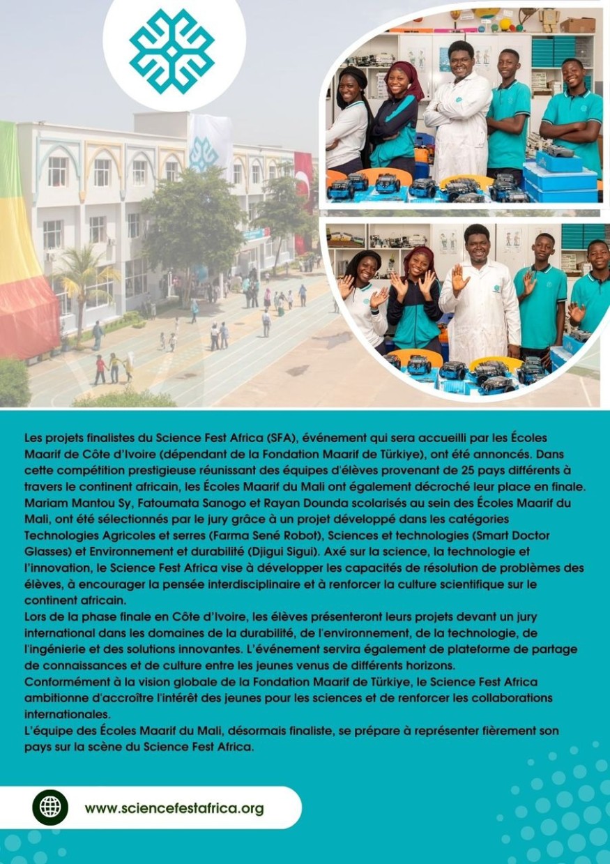 Lors du Science Fest Africa (SFA) 2026, qui sera organisé en Côte d’Ivoire par la Fondation Maarif de Türkiye, les Écoles Maarif du Mali se sont qualifiées pour la finale et représenteront notre pays sur la scène internationale.